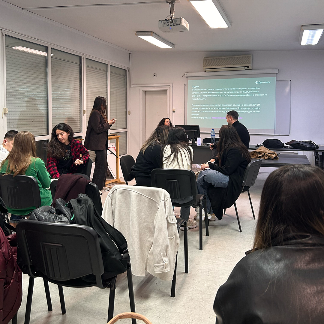 Благодарим на Илия Иванов и Ирена Първанова от Банка ДСК за споделения опит и за възможността студентите да работят по казус, близък до реалната професионална практика. Подобни срещи укрепват връзката между образованието и бизнеса и подпомагат развитието на умения за стратегическо мислене, креативна аргументация и работа по бриф.