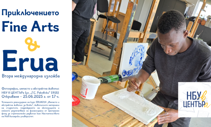 25 юни, 17.00 ч., НБУ в ЦЕНТЪРа. Експозиция представя резултатите на студенти от Алианса на европейските реформаторски университети – ERUA, след като четвърта поредна година се провежда интензивен курс ERUA014 „Импасто и абстрактна живопис за всеки“. По идея и под ръководството на гл. ас. д-р Румен Кожухаров студентите посещават Нов български университет в рамките на четири дена между 15 и 18 май през пролетния семестър на 2024/2025 академична година